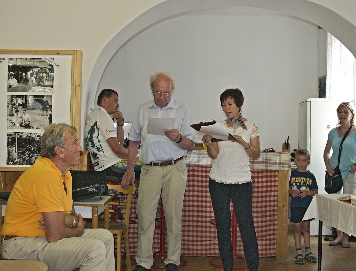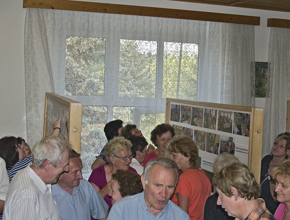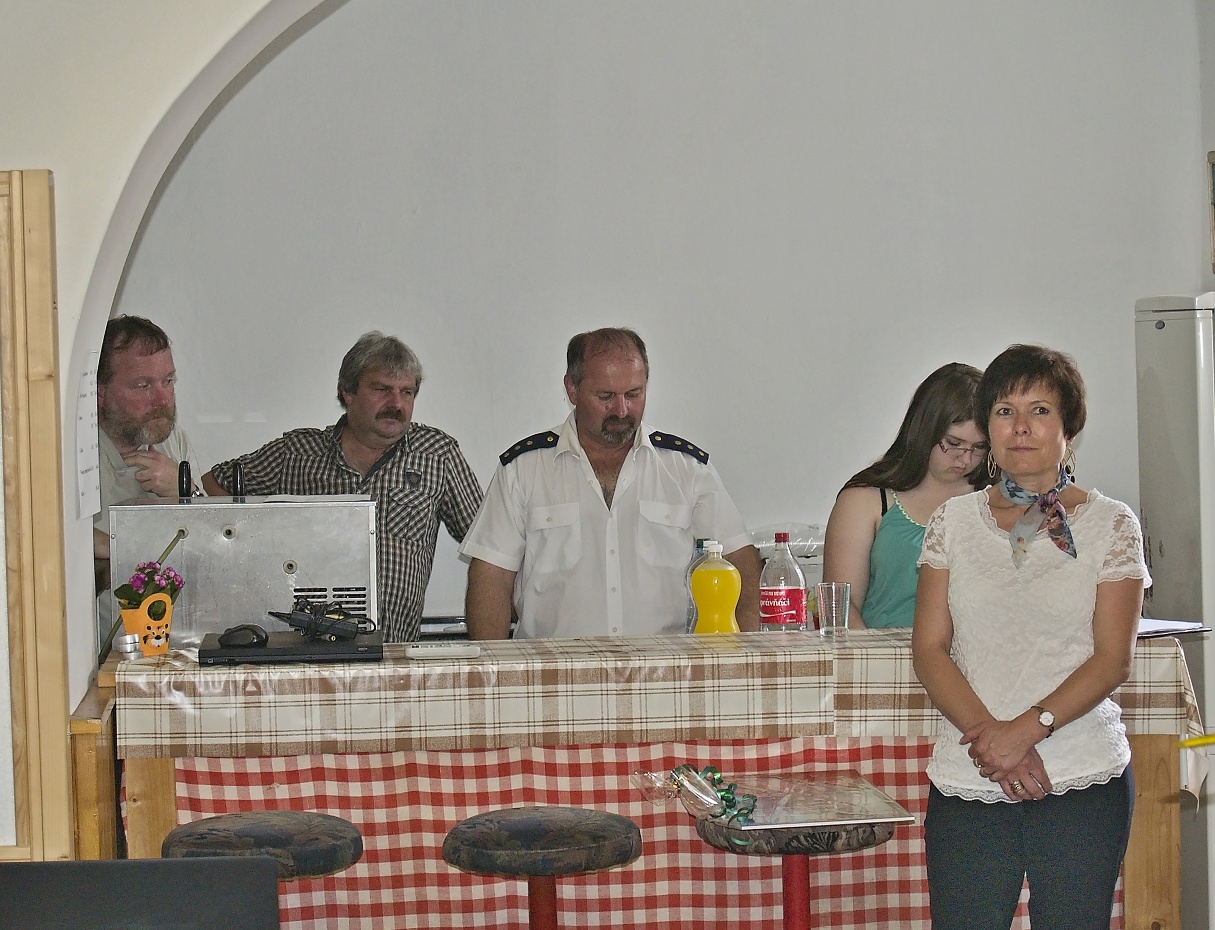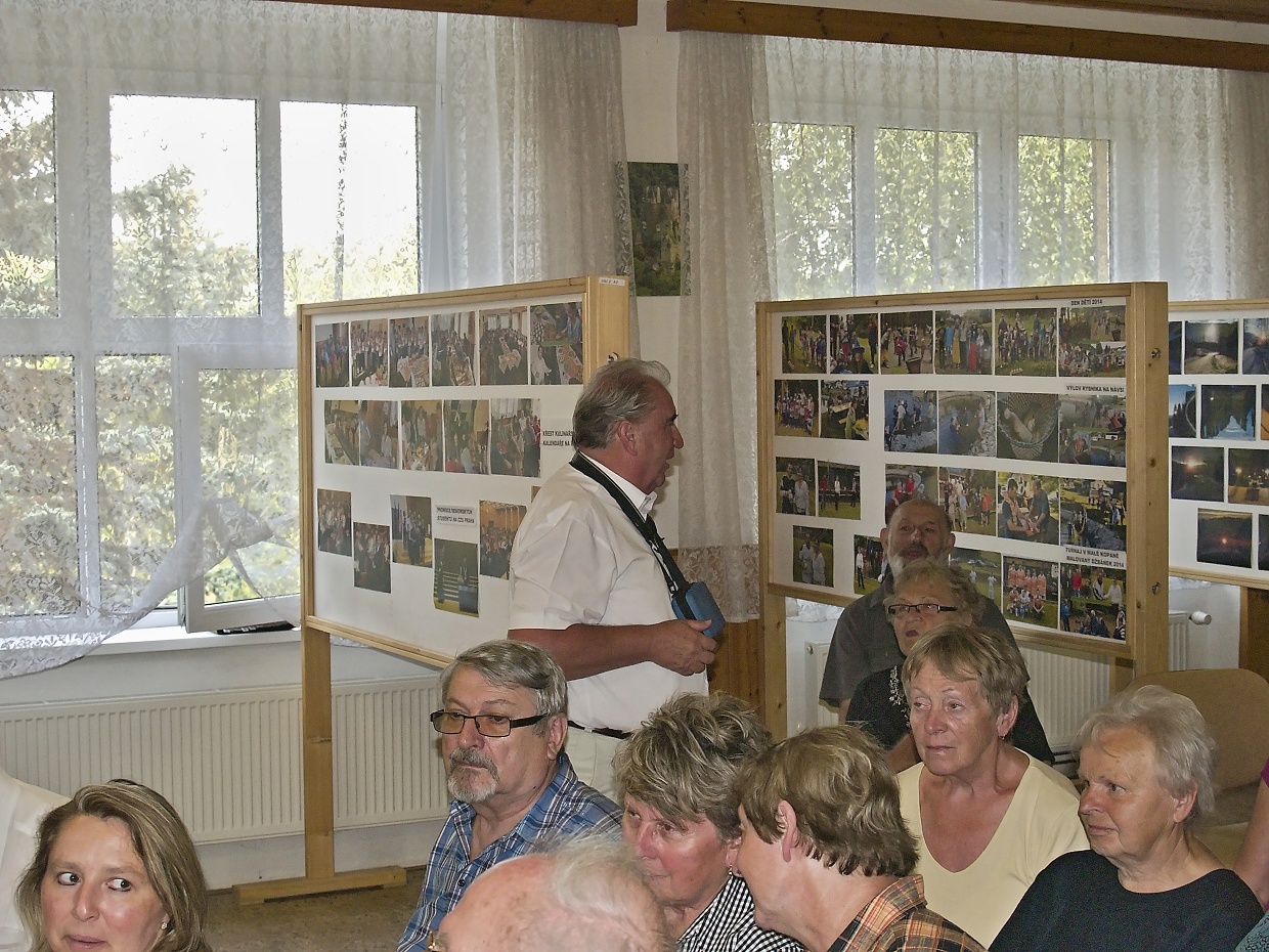 Ve druhé části galerie jsou obrázky ze společenské místnosti obecního úřadu, kde probíhal přednáškový program. Nejprve pohovořil pan Karel Mráz, bývalý profesor klatovského gymnázia o díle Rudolfa Mayera a hovořil s velkou znalostí jeho díla i života. Jak ostatně přiznal v závěru svého půlhodinového povídání, o tomto básníkovi by mohl hovořit hodiny. Dalším přednášejícím byl host, jehož bychom mohli nazvat "domácím" hostem. Josef Nejdl, ředitel Muzea Chodska v Domažlicích, se věnoval nikoliv cyklistice, jak to na první pohled na fotkách vypadá, nýbrž Janu Husovi, době po jeho upálení a hlavně křižáckým výpravám a bitvě u Domažlice. Téma jeho vyprávění už bylo všem přítomným poněkud bližší než básník Rudolf Mayer a dalo by se poslouchat mnohem déle, než byla vyhrazená doba. Třetí a nejkratší bylo povídání pana Hanse o Janu Husovi a husitských válkách v hornofalckém Bavorsku, doplněná obrázky. Bylo též zajímavé, do češtiny tlumočila naše starostka Jana Dirriglová, která také celé odpoledne zorganizovala a jeho děj postrkovala kupředu tak, aby měl spád. Což ocenil i starosta Všerub Václav Bernard, který přijel i se svojí manželkou. Z okolních obcí přijela též Marie Homolková, starostka Pocinovic. Jednotlivé přednášky odděloval muzikou Zdeněk Peroutka, občerstvení připravili a za barem se činili Milan Zimmermann, Josef Šváb, Ríša Honka, Karel Kacerovský a další pomocníci, chuťovky a sladké pečivo připravily místní ženy, dort upekla paní Wiesnerová. Ještě předtím, než se do chuťovek lidé pustili, proběhla jakási vernisáž fotografií Zdeňka Huspeka a Jana Křížka (jakási proto, že hodně lidí si fotky prohlédlo už v přestávkách mezi přednáškami), kde pan Křížek vystavoval obrázky na volné téma, zatímco pan Huspek kromě několika obrázků s názvem "Podzimní Loučim od Škalického lesa" vystavoval fotky z akcí v obci v roce 2014 a tudíž hlavně lidi... Mimochodem, obrázky, které starostka předávala přednášejícím jako dárek, jsou též foceny objektivem ZH a upravené speciálním programem. Celé odpoledne sledovalo téměř 70 lidí, k toho přibližně dvacítka hostů. Všichni na závěr dostali pamětní list, který obec nechala pro tuto příležitost zhotovit.