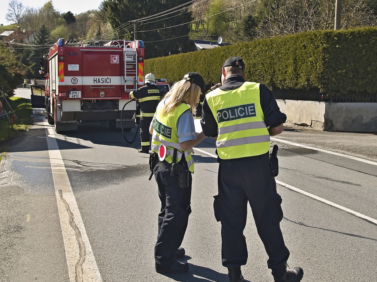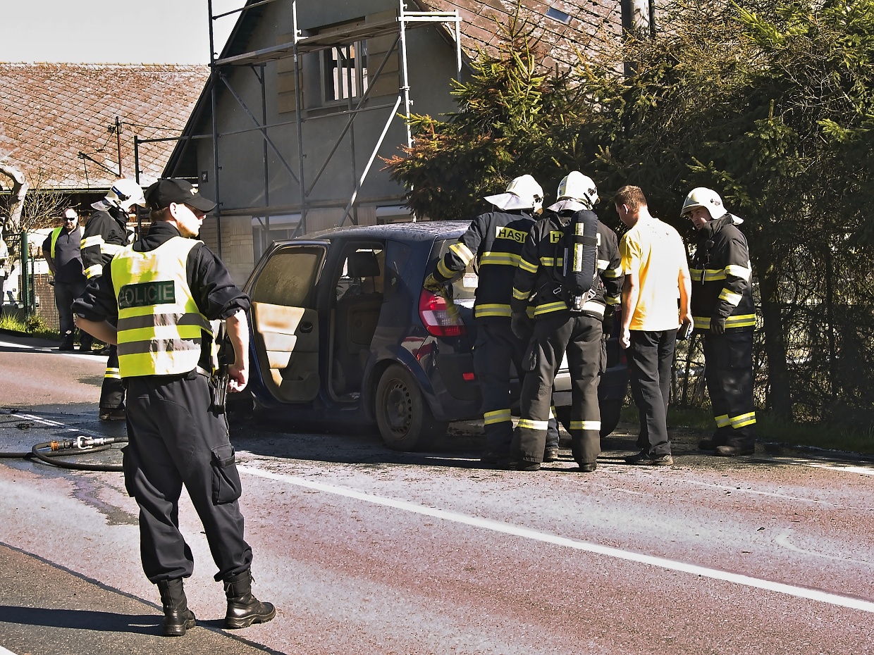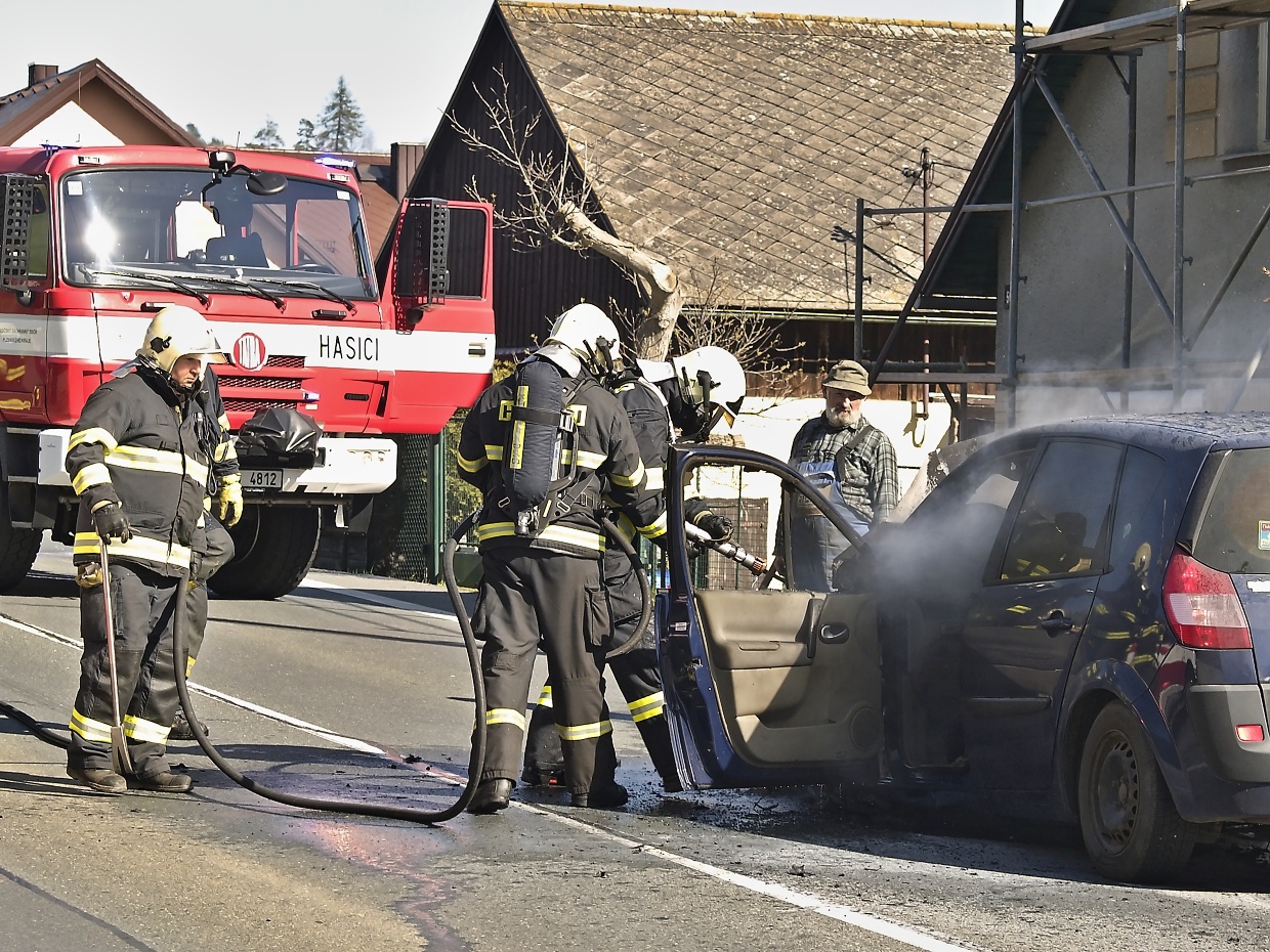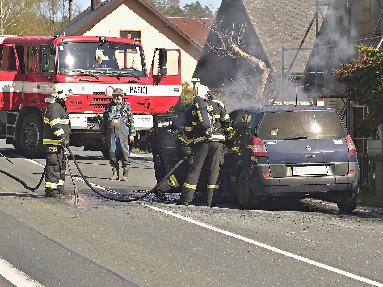 Loučim – Ve čtvrtek 21. dubna před půl pátou odpolední se na konci obce ve směru do Klatov zvedl za silnice černý kouř a několik minut nato zazněly sirény policejního a hasičských aut. Plameny vyšlehly z motorové části osobního auta zn. Renault, v němž cestovali manželé s dvěma malými dětmi. Na plameny pod autem posádku upozornil řidič, který jel za nimi a ten také pomocí svého hasicího přístroje začal oheň hasit spolu s velitelem místních hasičů Josefem Švábem, který se na upozornění HZS dostavil k zásahu jako jeden z prvních. Klatovští profesionálové pak auto uhasili a provedli nutná následná opatření. Jak patrno z fotografií, auto je na zrušení, posádka kromě šoku žádné zranění neutrpěla.