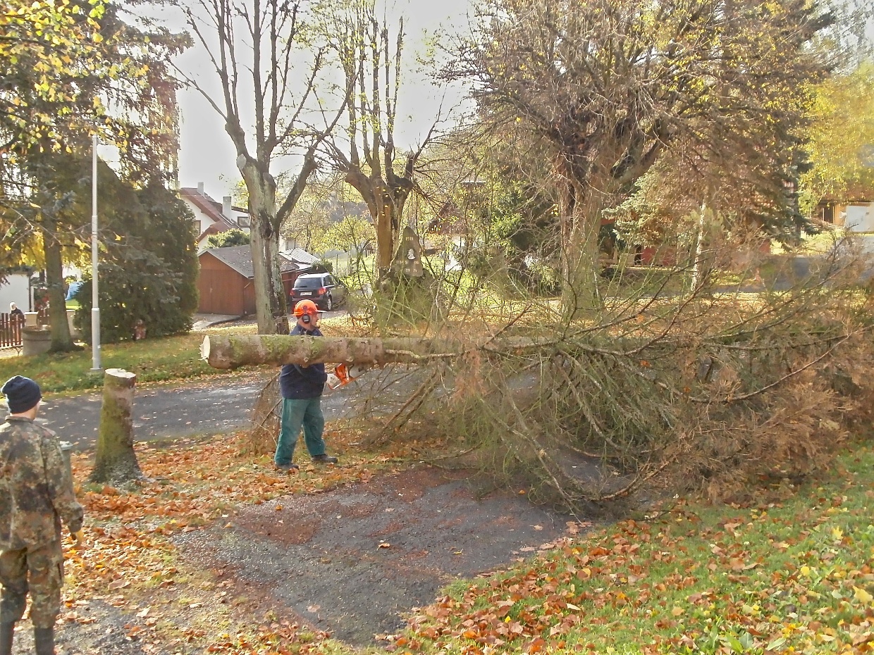 Státní svátek 28. října jsme oslavili prací. Pokáceli jsme dva smrky, napadené broukem a lehce upravili náves.