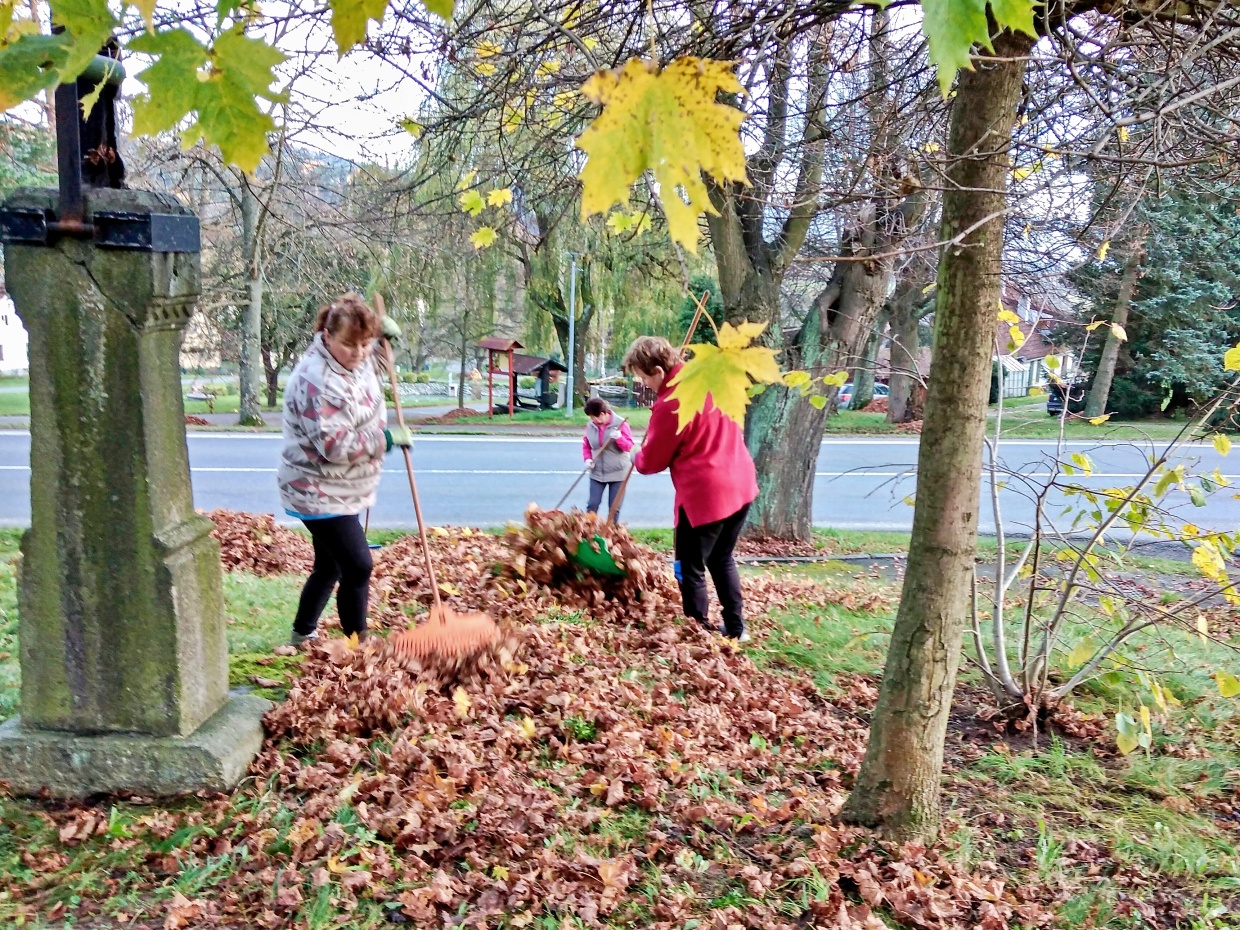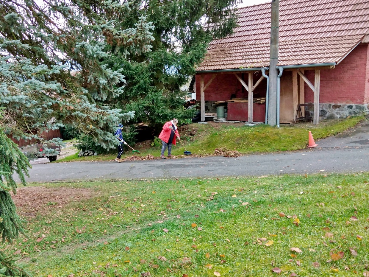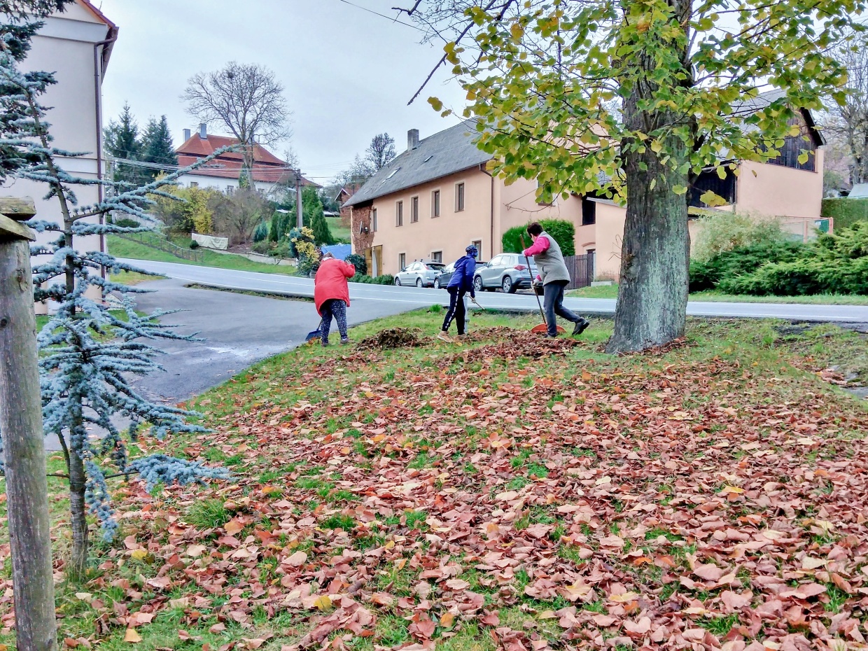 V pátek odpoledne 4 ženy a 2 chlapi a v sobotu dopoledne o jednu ženskou a další 2 chlapy více vyrazilo s hráběmi na náves a ke hřbitovu hrabat spadané listí. Z návsi pak v sobotu hromady zlikvidovalo dalších 5 mužů a traktor.