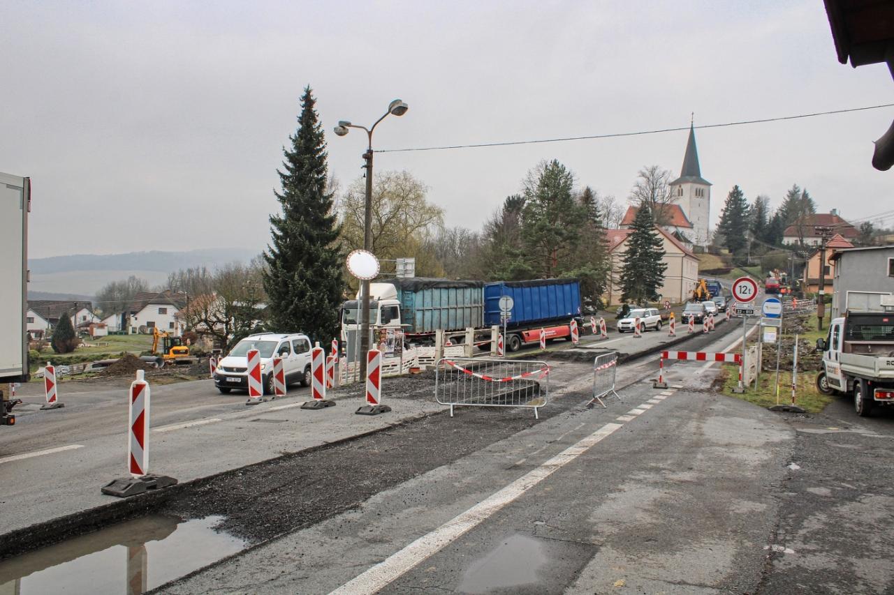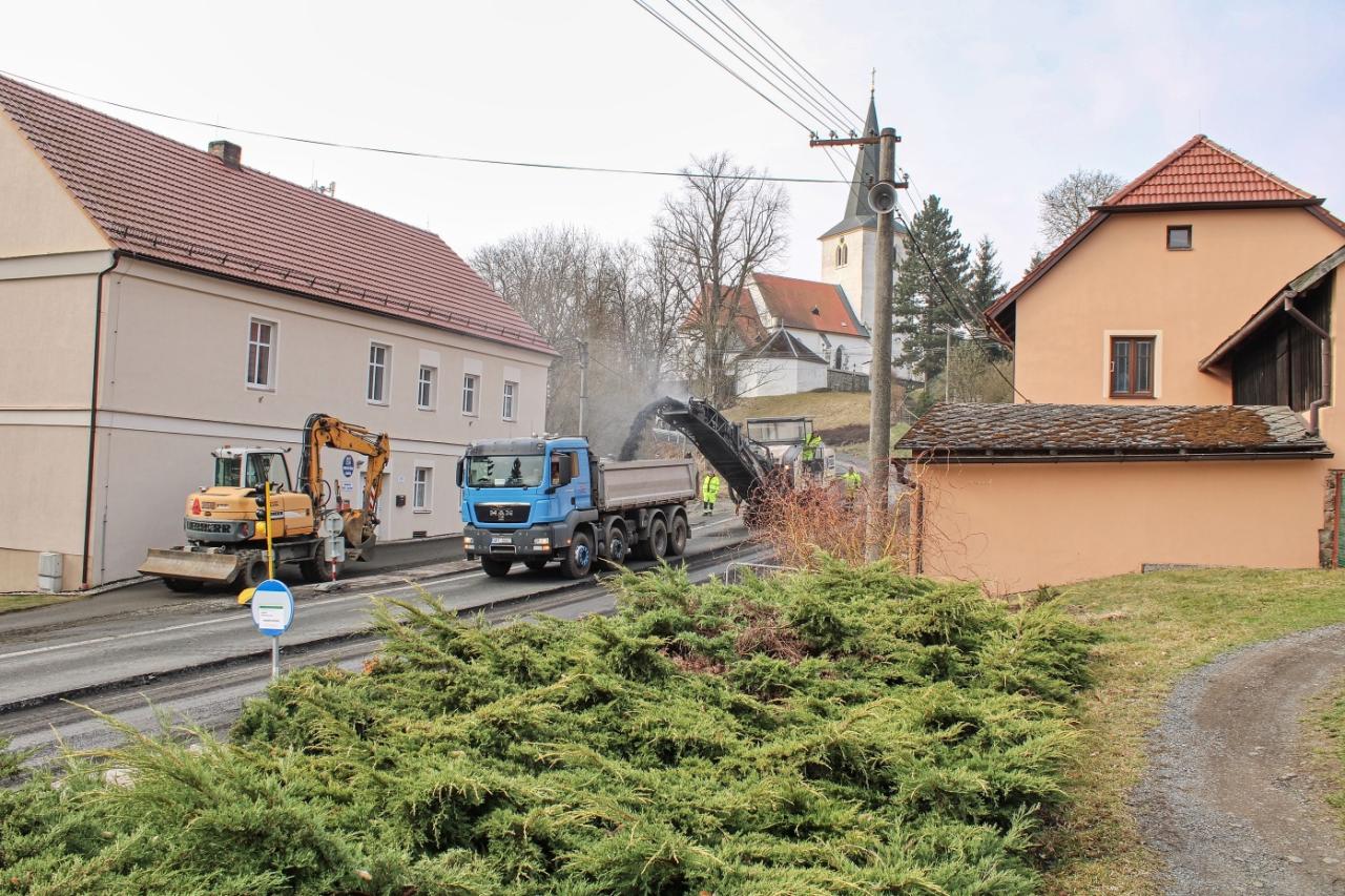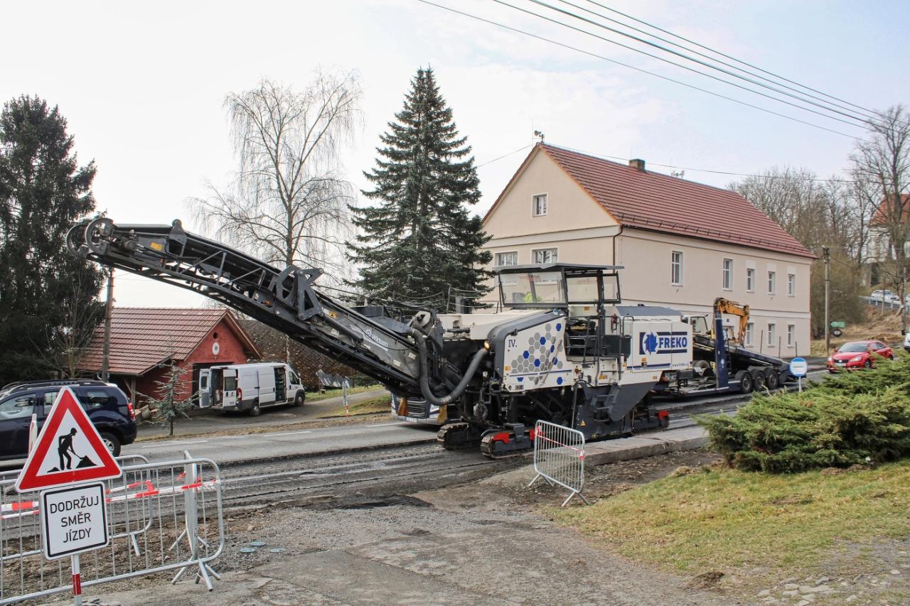V pondělí 24.3. se začal frézovat levý pruh průtahu, o den později nám řekl stavbyvedoucí Roadfinu Patrik Vyleta: „V současné době máme vyfrézovanou polovinu, protože fréze se včera porouchal pás, pokračovat se bude ve středu, od čtvrtka by měly probíhat práce na demontáži mostního objektu vedle hospody, což by mělo trvat přibližně 10 dní. Jde o to, že se tam musíme provést všechny stoky, až už se jedná o splaškovou a dešťovou kanalizaci a taky o vodu shora nad obcí. Souběžně budou probíhat práce na položení splaškové kanalizace, ty budou probíhat pořád. Po odfrézování budeme kopat štěrky, začneme provádět skrývku konstrukčních vrstev, aby kolegové mohli udělat dešťovou kanalizaci, která bude v polovině levého jízdního pruhu ve směru na Klatovy."