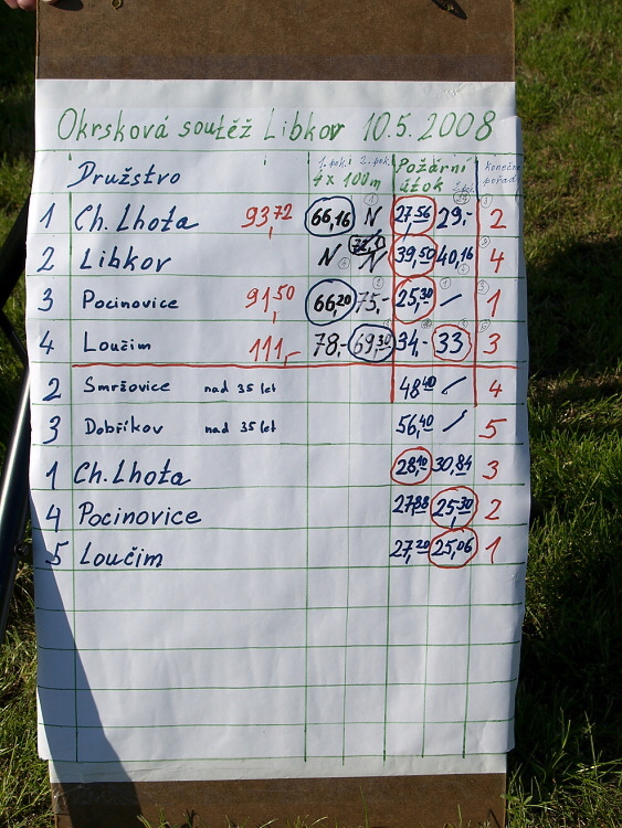 Okrsková soutěž v požárním sportu se letos konala u našich nejbližších sousedů - v Libkově. V sobotu 10. května 2008 jsme po obědě vyrazili několika osobními auty, Tomáš za sebou táhl káru se strojem a vybavením a v krásném sportovním areálu v Libkově jsme byli jako první. Soutěž probíhala jako jiné roky, obsadili jsme obě kategorie (do a nad 35. let). V krásném, slunečném, byť trochu větrném odpoledni se běžela štafeta a soutěžilo v útoku. V kategorii do 35 let jsme obsadili 3. místo (na víc zatím nemáme), v kategorii starších jsme letos, po dlouhých letech, porazili Pocinovské a vyhráli! Několik fotek je v galerii, další pak zde!