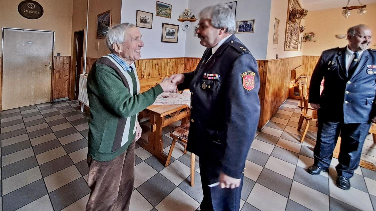 Další jubilantem v tomto měsíci a roce byl Pepa Dědina, jemuž k pětasedmdesátinám přišly blahopřát obě delegace - za obec i za hasiče.